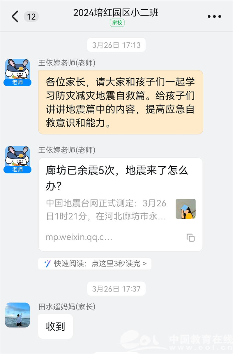 教师积极利用班级钉钉群向家长宣传地震应急知识,详细讲解地震来临等应急避险方法与自救互救技巧,致力于提高家长的安全意识与应急处理能力。家长们表示,经教师讲解,他们对地震应急有了更深理解,也更重视家庭安全教育。