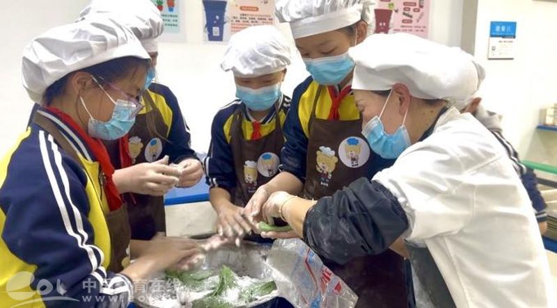 校园食堂里飘着糯米香,在食堂赵阿姨的带领下,同学们抢着切艾草,揉粉,包馅,做造型,同学们各个干劲十足。“啊呀,我的馅露出来了”“我怎么一直搓不圆”……食堂里充满了欢声笑语,一派其乐融融。