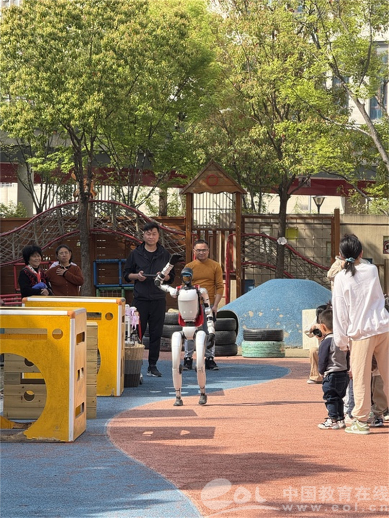 除了跳舞之外,机器人的操作者——来自大三班的胡人禾爸爸还与孩子们进行了问答游戏。孩子们好奇地问“机器人会不会说话”“机器人能不能双脚离地跳跃”这些充满童真的问题,让孩子与机器人走得更近,享受着与高科技产品亲密接触的乐趣。