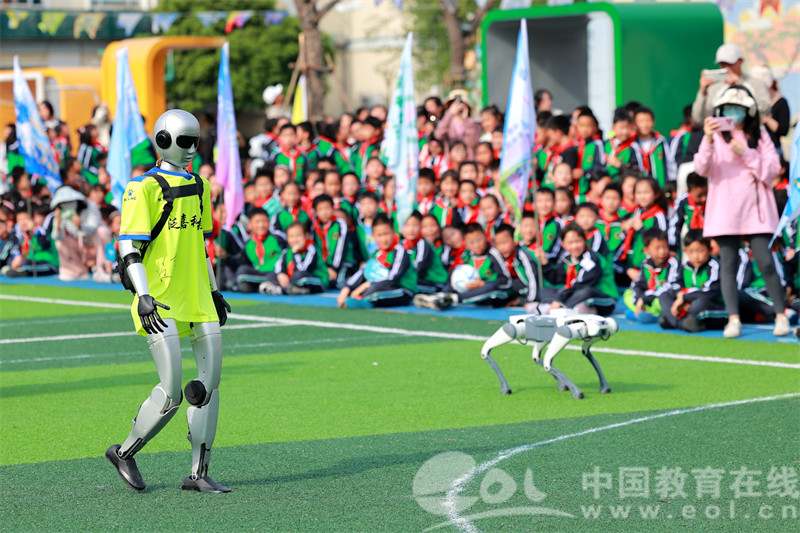 趣味互动环节将气氛推向高潮。各班班主任化身“领队射手”,在师生欢呼声中展开射门比赛,展现了课堂之外的活力风采。随着省足协领导、区领导与包国勇校长共同为足球赛开球,宣告体育节正式启幕。紧随其后的科技与体育融合表演令人耳目一新:泛嘉科技公司给我们带来了精彩的科技表演:机器人、机器狗灵活展示,无人机悬挂足球上演“空中对抗赛”,赢得阵阵喝彩。