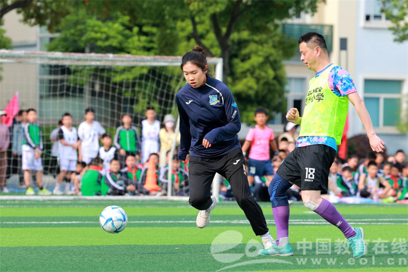 压轴环节的足球特色展示尽显学子风采。最后,由星洲小学明星家长足球队对阵杭州银行女足与师生联队的友谊赛激情开战,家长、师生、女足队员在场上传递足球的快乐,织成一幅生机勃勃的校园体育画卷,为开幕式画上圆满句号。