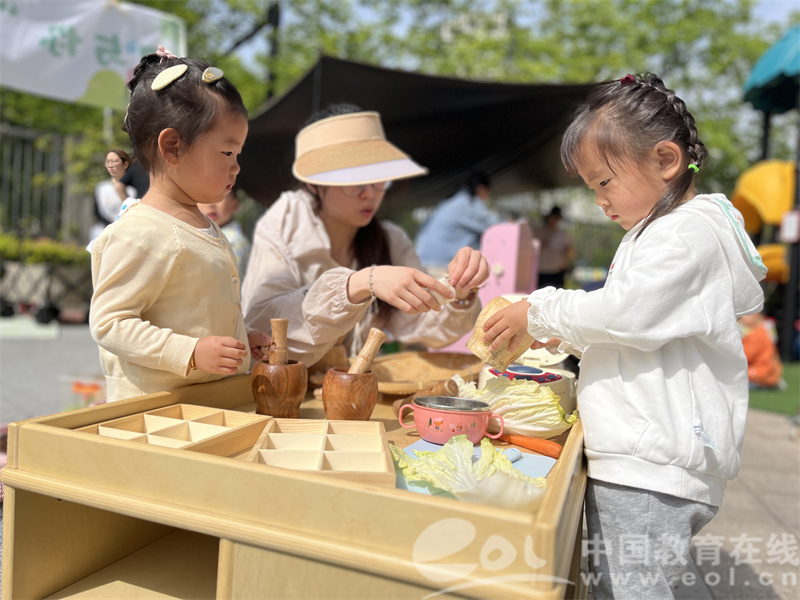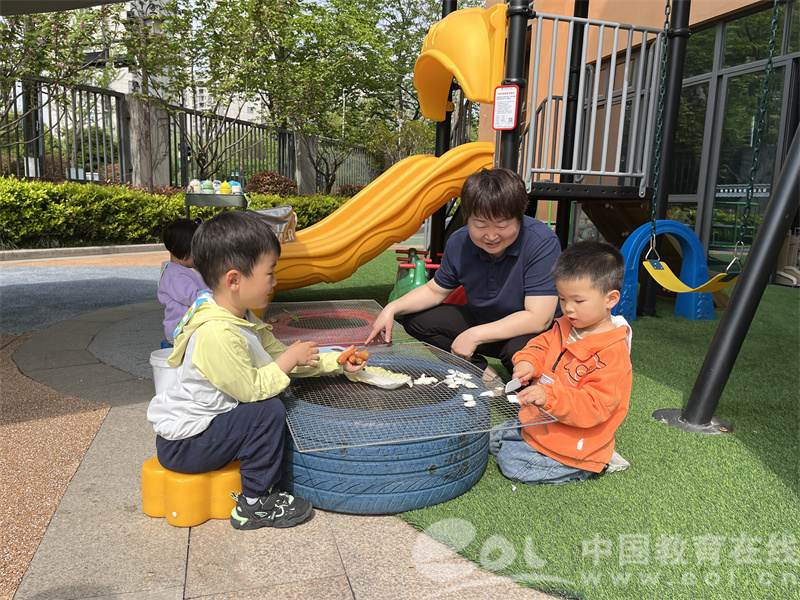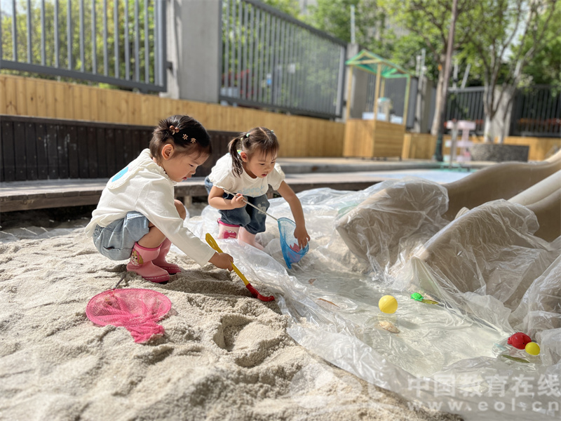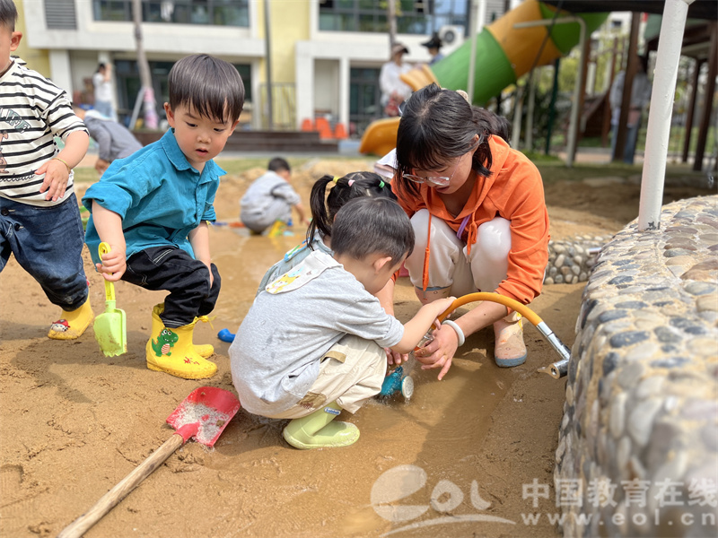 沙水区域里的孩子用小铲子和水桶忙碌地建造自己的“水利工程”,他们或挖渠引水,或堆砌沙堡。沙池里还藏了不少宝藏,孩子们小心翼翼地挖掘,仿佛每一次铲子落下都能发现新的奇迹。教师积极参与孩子们的游戏,细心观察孩子们的一举一动,通过温柔的言语和肢体语言给予积极的回应。