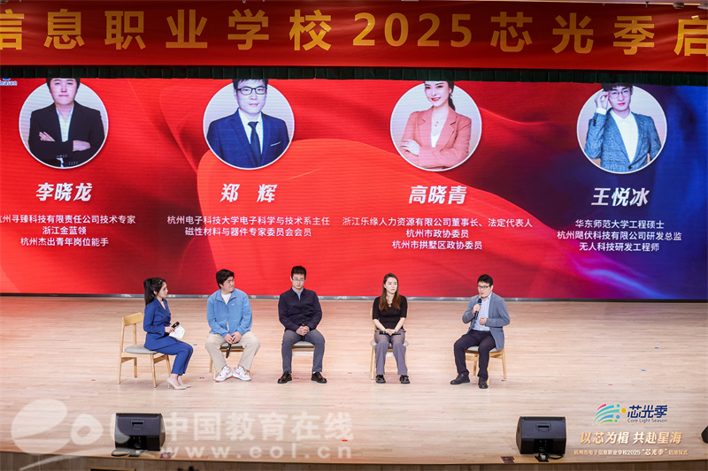 在随后的“芯智对话”微访谈环节中,杭州电子科技大学电子科学与技术系主任郑辉、浙江乐缘人力资源有限公司董事长高晓青、杭州寻臻科技有限责任公司技术专家李晓龙、杭州飓伏科技有限公司研发总监王悦冰展开跨界探讨。围绕“AI时代的人才素养”话题,嘉宾们从技术伦理、终身学习、跨界协作等角度建言,为学子们擘画了未来成长路径。