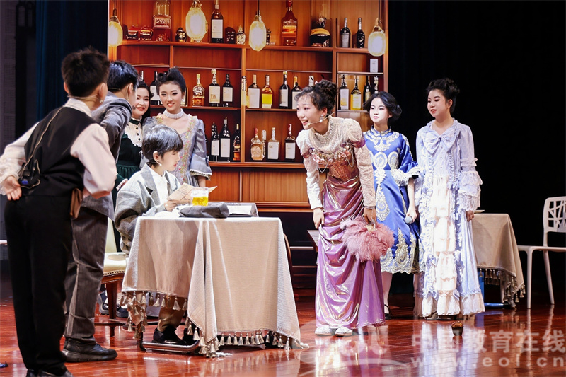 六(1)班演绎的《百万英镑》,以一张巨额钞票为引,揭开19世纪伦敦街头金钱与人性的荒诞寓言;六(2)班身着战袍,用中文戏剧《花木兰》诠释巾帼英雄的忠孝大义;六(3)班以英文版《大闹天宫》重现金箍棒横扫天庭的东方奇幻;六(4)班挑战莎翁经典《威尼斯商人》,在契约与道义的冲突中叩问人性本质;六(5)班将教室化作摇滚舞台,用中英双语音乐剧《摇滚学校》演绎反叛与和解的青春宣言;六(6)班则以《长安三万里》带观众梦回大唐,让李白、杜甫的诗句在少年们的演绎中重焕光芒。