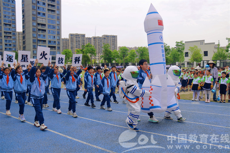 各班级代表队围绕国防、科技、传统游戏等主题,精心编排入场式节目。身着迷彩服的同学手持仿真手枪,步伐整齐,口号嘹亮;穿宇航服、拿火箭模型的孩子,展示航天辉煌;中低年级学生则用跳牛皮筋等传统游戏,唤起文化传承热情。随着周校长宣布运动会开始,烟花绽放,现场成了欢乐的海洋。