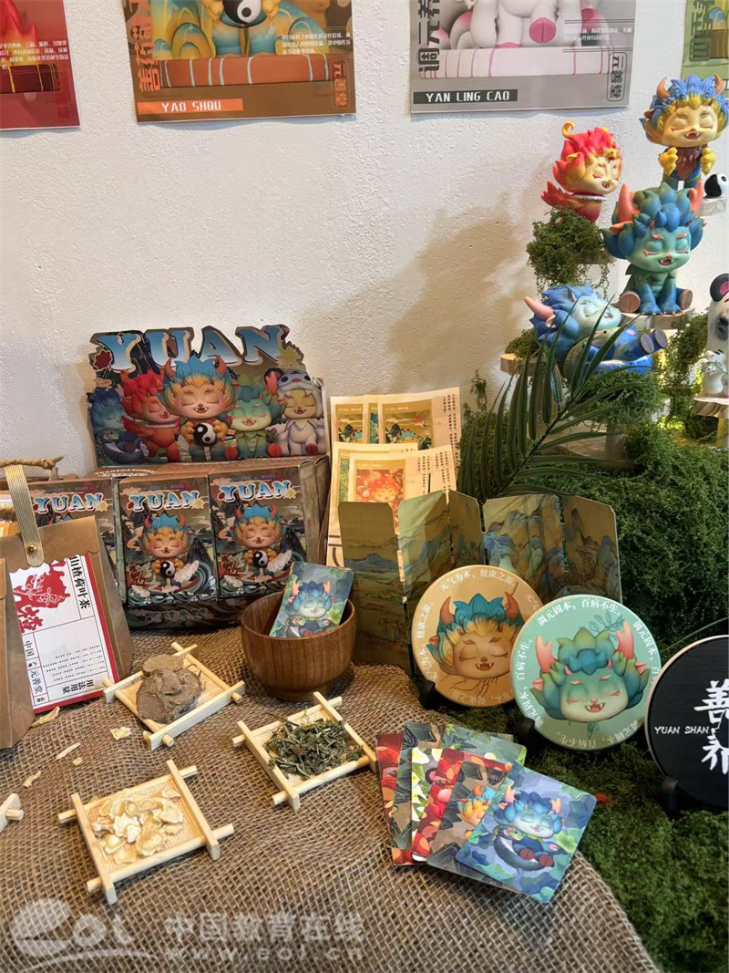 一旁一个年轻游客说:“我喜欢这个小龙人,可以挂在我的书包上,它叫青龙,它穿的衣服是桐庐的草药做的,设计师姐姐说拆开不同的盒子可以给小青龙穿不同的衣服。”
