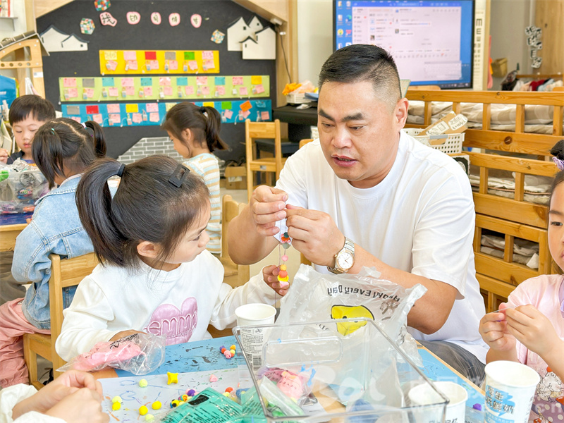 小班的孩子们手持颜料瓶,用颜色染布,色彩斑斓的图案在他们的巧手下逐渐成型,每一种颜色都承载着对妈妈深深的爱意与祝福。当小包包初具模样,孩子们又开始为它制作独一无二的珠子拉链。爸爸耐心地帮助孩子们挑选珠子和串珠子。他们用五彩的珠子,一颗颗细心地串起,再将这串珠链巧妙地安装在包包上,那灵动的珠子仿佛是孩子们眼中闪烁的爱意,每一次拉动,都是对妈妈深情的诉说。