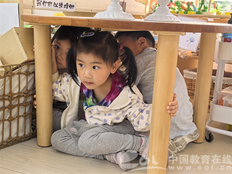 随着尖锐的警报声骤然响起,地震消防安全演习正式启动。正在开展活动的幼儿们在教师的迅速指引下,果断采取避险措施。他们迅速双手抱头,就近躲在坚固的课桌下。