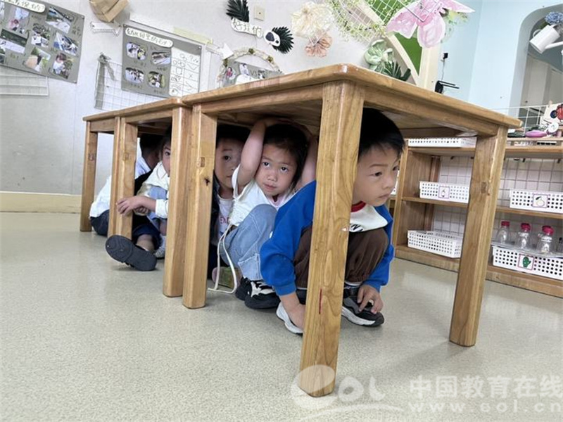 清晨的阳光中,大班教室变成安全教育小课堂。孩子们身穿"安全小卫士"马夹,用童趣语言向托班、小班的弟弟妹妹讲解地震知识。"当地震警报响起来,要像小刺猬一样快速蜷缩,躲到桌子底下或三角区域。"大班的孩子们不仅示范了标准的"伏地、遮挡、手抓牢"避险姿势,还手把手教弟弟妹妹用小枕头保护头部。在撤离环节,大班孩子主动牵起弟弟妹妹的手,模拟弯腰护头的撤离动作,反复练习"不推挤、不回头"的安全准则,用行动诠释着责任与担当。