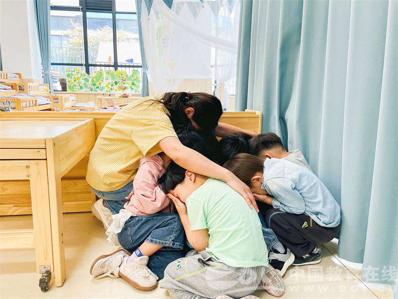 演练开始,一名“坏人”试图强行闯入幼儿园,保安人员迅速反应,立即上前阻拦,并迅速发出警报。幼儿园应急指挥中心接到警报后,第一时间启动防恐应急预案,通知全体师生“有危险情况发生,立即启动防恐应急措施”。老师们听到警报后,迅速组织幼儿快速有序地返回教室,将教室门窗紧锁,用桌椅等重物抵住门,防止“坏人”进入。同时,老师们安抚幼儿情绪,让孩子们躲在教室角落,保持安静,不要发出声音,避免引起“坏人”的注意。