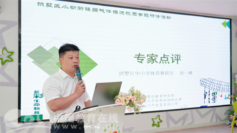 拱墅区中小学体育教研员赵一峰点评称:“衔接的关键在于尊重成长规律,幼儿园培养兴趣,小学夯实技能,二者缺一不可。”他认为器械体操与幼小衔接的结合是一个立足未来发展的必然需求,应坚持培育“眼里有光,身上有汗,四肢有力”的学生;做好小幼衔接是努力打造区域体育特色的关键一步,应努力实现一区多特的区域体育新样态;体育锻炼是学生成长的刚需,应响应当代学生发展的需求,通过体操项目有针对性地对学生身体素质及意志品质进行培养。他倡导通过“创新实践”“师资保障,双向赋能”“家校协同、破除壁垒”三个方面逐步帮助学校进一步落地科学有意义的小幼衔接。