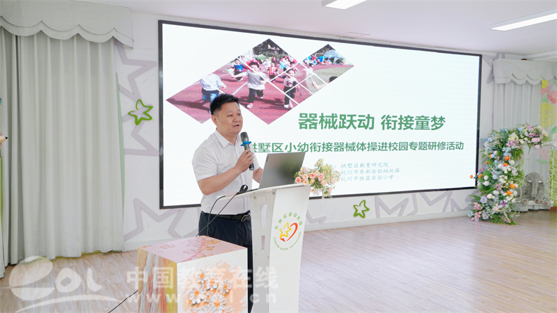 杭州市现代实验小学党总支书记张刚充分肯定本次小幼衔接活动的意义,对从物理衔接到深度融合的“化学衔接”方式表示赞赏。他强调要培养“眼里有光、身上有汗、四肢有力”的孩子,并提出通过课题引领、全员进阶、榜样接力三个方面,推动幼小一体器械体操走进小学。
