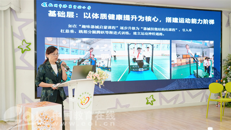 胜蓝实验小学校长陈群云介绍了学校以体育为核心推进小幼衔接,构建“三维阶梯课程”的实践分享,她表示,“幼儿园有的特色项目,我们小学不仅要衔接好,更要发扬好。”