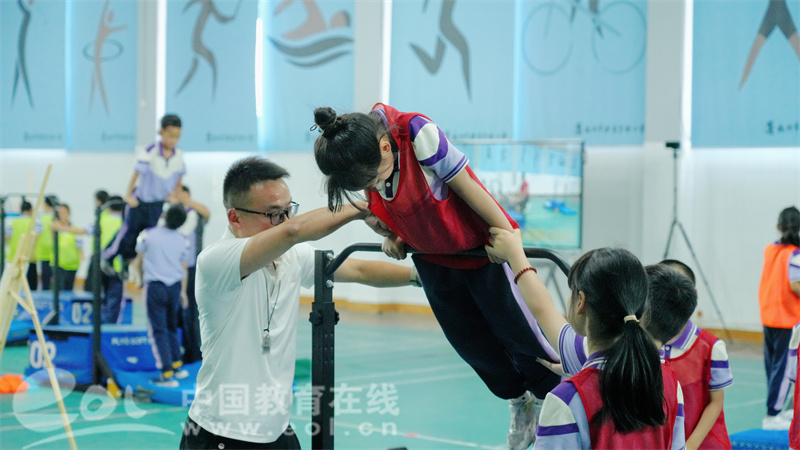 胜蓝实验小学余建康表示,从幼小衔接视角出发,设置单杠“跳上成支撑翻身上”课程,旨在培养儿童基础运动能力与心理适应性。该动作不仅能锻炼上肢力量、核心稳定性和身体协调性,为小学体育课器械项目学习奠定体能基础,还能通过帮助孩子克服高度恐惧、完成连贯动作,提升自信心与抗挫力,助力其适应小学更具挑战性的体育学习,实现从游戏化活动到结构化技能训练的平稳过渡。
