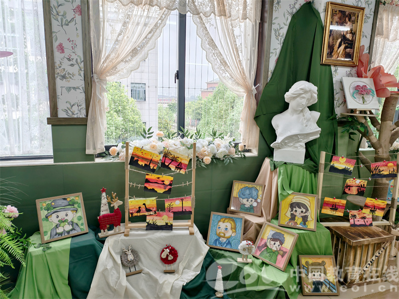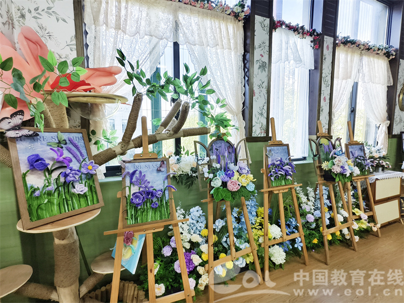 潘佳眉老师的专业教室以莫奈花园为灵感蓝本,原木色画架错落有致地排列,彩色的绘画作品、缤纷颜料、柔软的扭扭棒等艺术材料有序陈列,宛如调色盘般绚丽多彩。自然光线透过藤蔓缠绕的窗户倾泻而入,为每一幅精美的作品镀上温柔的光晕,作品摆放的每一处细节都在无声诉说着对美的尊重与追求。