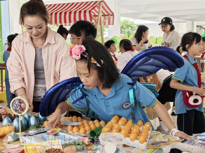 “小顾客”们则穿梭在各个摊位之间,仔细挑选心仪的玩具,还不时和“小老板”讨价还价,童趣十足的交易场景随处可见。