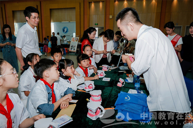 “小小牙医”张瑞龙医生提供牙齿模型和内窥镜,让孩子们学习科学刷牙、检查“龋齿”,穿上白大褂体验牙医职责。“视光师”陈独亚通过验光模拟设备,引导学生关注视力健康,学习护眼知识,扮演专业的视光师。