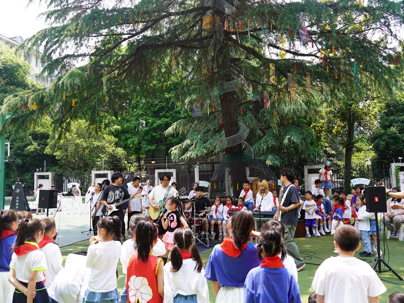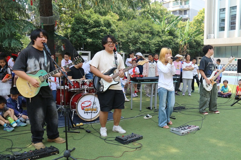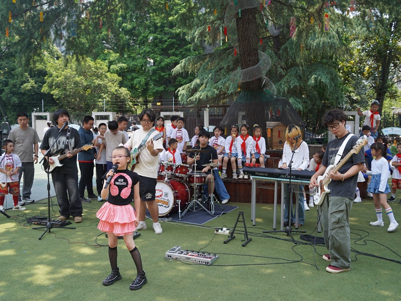 今年的“六一”儿童节,九莲小学在传统庆祝活动的基础上,创新形式,特邀一支来自高校的大学生乐队走进校园,为学生带来一场露天音乐会。学校音乐组老师们精心策划,将舞台设在了校园标志性的松树下,让同学们在自然与艺术的交融中感受音乐的魅力。