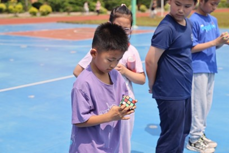 解绳大挑战比赛台上,选手俯身观察,发现未被压住的绳子便快速抽取。别小看解绳,捏绳、拆结,这是脑力与手速的双重较量。溜溜球比赛同样精彩,低年级学生比拼一分钟垂直收放次数,高年级学生挑战“睡眠”时长,小小的溜溜球在空中划出优美弧线。魔方挑战赛中,选手手指在魔方上快速翻飞,三四年级学生专注单面还原,五六年级学生挑战六面速解,魔方在他们手中仿佛被赋予生命,色彩快速变幻。