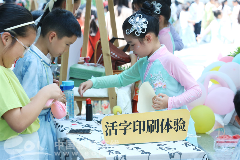 在三年级的“书法美学”展区,同学们在301班“千载墨意·宋韵雅集”中,手写古风书签,还在302班“墨趣宋韵・童心书怀”中体验活字印刷术,感受墨韵流淌。