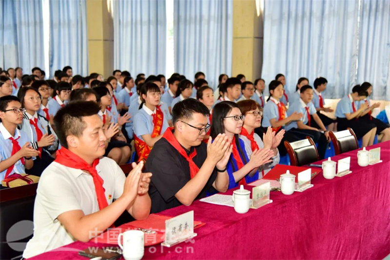 这不仅是一场在儿童节前夕与纯真童年告别的温馨盛会,同时也是队员们收到的一份特别的成长礼物,更是一次开启青春征程、勇担时代使命的盛大启航。校党支部副书记彭琼霞老师、八年级主任黎胜平老师、八年级组长陈莉莉老师、大队辅导员助理张建州老师、校家委会会长侯省委先生以及八年级各中队辅导员老师共同出席了本次活动。活动由801中队罗宇涵和804中队沈宇卿队员主持。