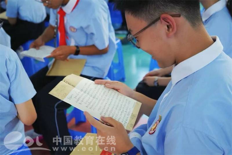 成长的航程,总有灯塔指引。活动现场还播放了来自老师和家长们的青春寄语视频。屏幕那头,是师长们殷切的目光和谆谆教诲,校党支部书记、校长陈积粮和八年级主任黎胜平老师以春风化雨般的话语传递期望,将教育初心融入每一句嘱托;字里行间,是家长们无尽的关爱、坚定的鼓励与深沉的期许,温暖的力量在会场中流淌。在这个意义非凡的成长节点,一份份承载着父母万千叮咛与浓浓厚爱的“家书”,由各中队辅导员亲手递到每一位队员手中。