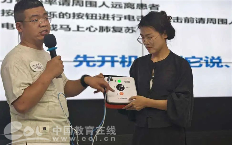 当AED 送达后,刘老师进一步指导大家,要迅速按下AED 电源键,全程听从AED的语音提示操作。在贴电极片时,裸露患者胸部,擦干汗水或水渍,电极片一片贴在右胸上方,另一片贴在左胸侧边(腋下约5厘米处)。贴好后,AED自动分析患者心律,确保没人接触患者后,按下电击按钮,根据患者情况开始电击。电击后立即进行心肺复苏。