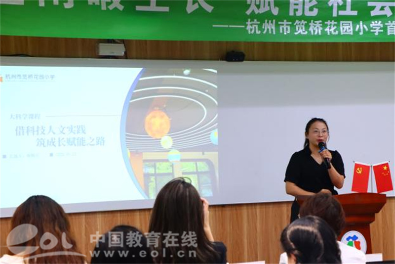 俞靓沁以“借科技人文实践、驻成长赋能之路”为主题进行汇报,介绍花园小学“校园即花园,教育即生长”理念下的大科学课程体系,阐述社会情感能力与课程双向赋能,讲解课程培养的三维目标。大科学课的学生用情景小剧场的形式向大家展示了从大科学课程中的收获,直观展现课程对学生科学素养与社会情感能力的双向赋能成效。