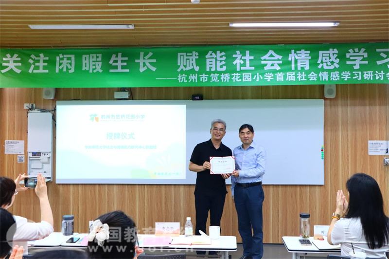 黄忠敬现场为笕桥花园小学颁发华东师范大学社会与情感能力研究中心联盟校的授牌,这不仅是对学校过往工作的高度认可,更是激励全体师生不断前行的强大动力。