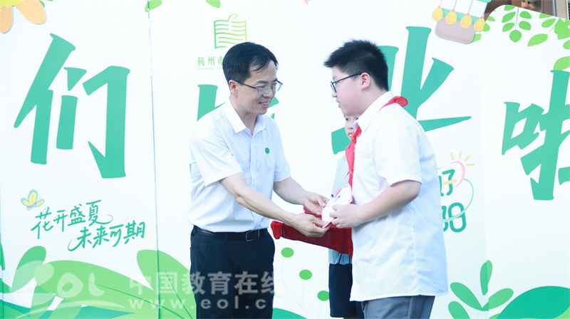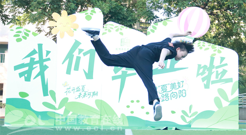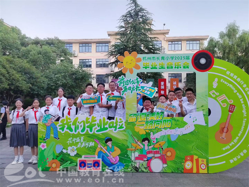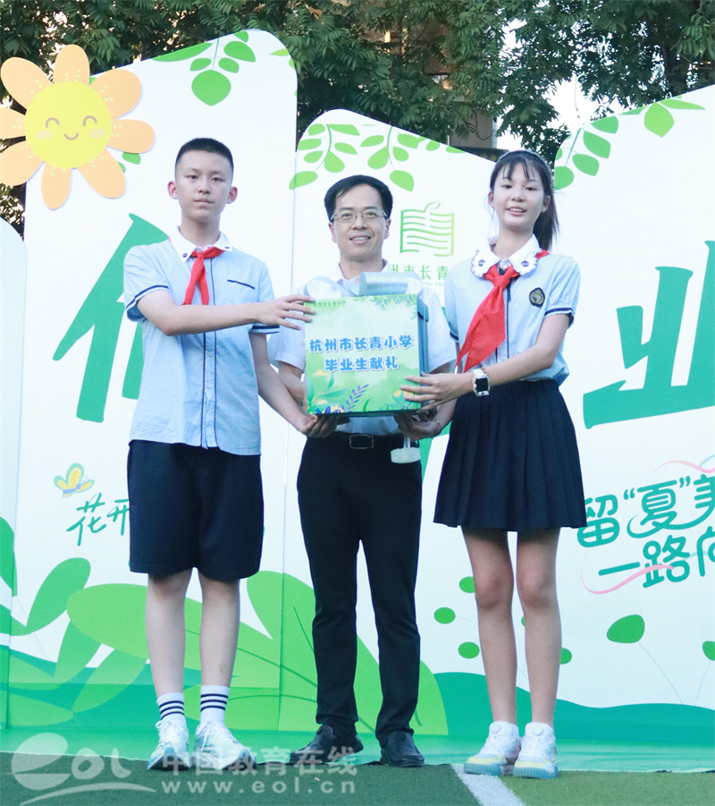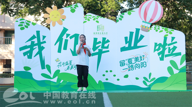 中国教育在线浙江站讯 (记者 陈显婷 通讯员 俞玲娜 李秀群)“一年级时我们就是在这里戴上红领巾,成为一名光荣的少先队员”“入学第一天,我还在门口和吕老师合了影”……孩子们七嘴八舌地回忆着以前的美好时光,享受小学最后一次集体活动。7月1日,杭州市长青小学三塘校区没有寻常校园的安静,取而代之的是拱门、红毯、欢笑与隐约的泪光——六年级毕业生迎来了他们盛大的告别仪式。