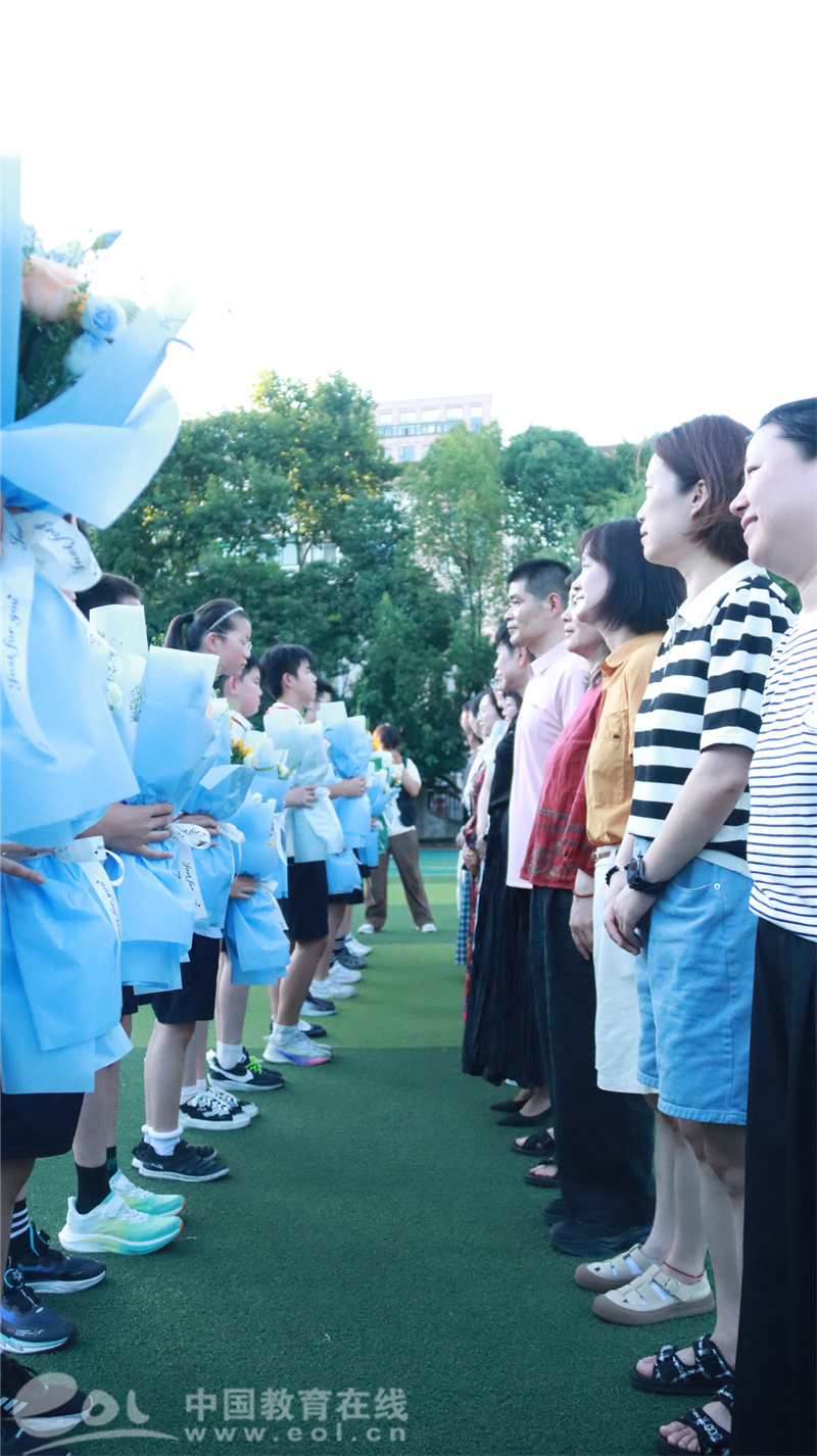 感人的献花环节随即展开。605班的优秀毕业生手捧鲜花,快步走向陪伴他们六年的毕业班任课老师,向他们表达真挚的感谢。一声声“谢谢您!”,让平日里严肃认真的老师们也深受感动,眼中闪烁着泪光