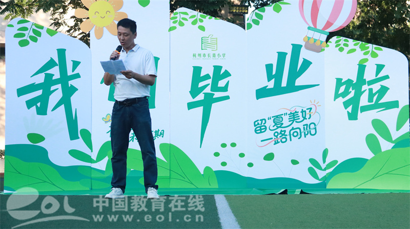 601班周宇帆同学的家长作为毕业生家长代表上台致辞。周爸爸深情回顾了孩子们在长青小学从稚嫩孩童成长为阳光少年的点滴变化,欣喜于他们在知识、品格和能力上的显著进步。他动情地表示:“作为家长,我们不仅见证了孩子的蜕变,更深切感受到了老师们无私的付出和学校‘以生为本’的教育理念。