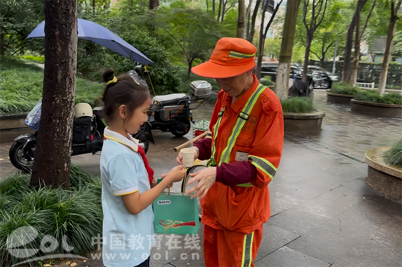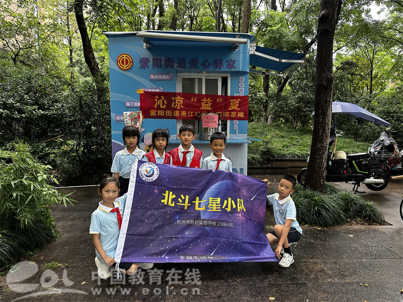 中国教育在线浙江站讯 (编辑 鲁少辛)7月的杭城,骄阳似火。在紫阳街道“爱心驿家”及甬江社区公益凉茶摊,一场名为“沁凉‘益’夏”的志愿服务活动正温情上演。来自杭州市胜利实验学校二(6)中队北斗七星小队的孩子们化身“小小志愿者”,用一杯杯凉茶和一份份关爱,为烈日下的城市守护者送去夏日清凉与诚挚敬意。