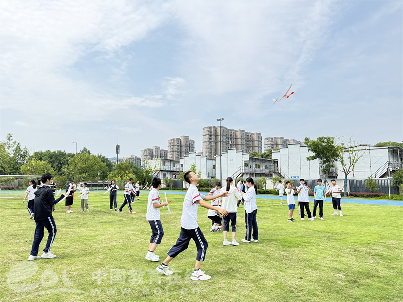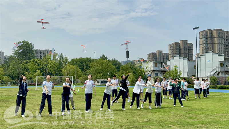 “我的飞了10秒!”“我这个飞不起来呀!”孩子们追着航模跑,互相分享成绩,操场上满是欢呼和笑声。