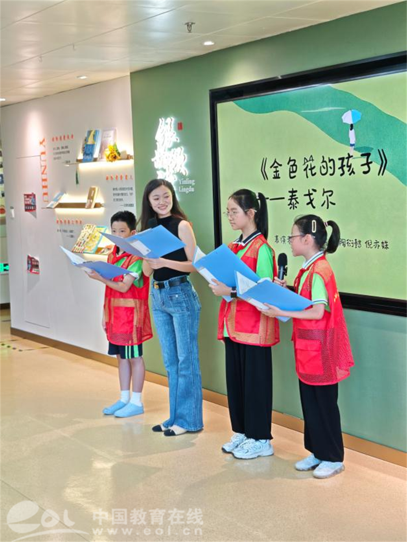 罗老师与陈诺、陶衍懿、倪亦姝三位同学率先登场,共同朗诵《金色花的孩子》,诗中“小温暖”蔓延开来,台下掌声阵阵,为这场秋日之约增添温情。