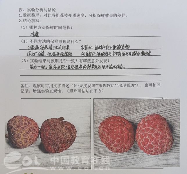 从冰窖贮藏、竹筒密封,到草木灰水抑菌,同学们对比古籍记载设计科学实验,亲手操作盐水浸泡、真空、冷藏等方法,记录荔枝“色香味变”的过程。他们在数据与现象间寻找古人智慧的现代表达,更体会到“一日而色变”背后的时间紧迫。学生们通过对照实验,竟然都发现了“真空组”保鲜时间最长,而非想当然以为的“冷藏组”。同学们亲自动手实验记录的数据最让人惊喜信服!