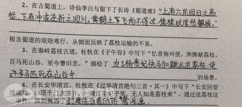 从杜甫的“忆过泸戎摘荔枝”到杜牧的“百马死山谷”,学生在诗句中辨认荔枝转运的踪迹,赏析诗人借物讽喻的文学笔法。他们在文字中体察到文学不再是孤立的名篇赏读,而是历史场景中有温度的回响。