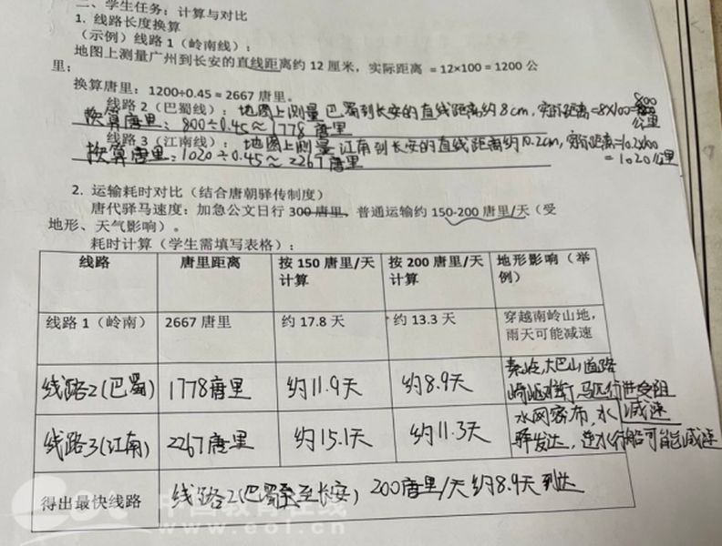 结合唐代地图与驿传制度,学生分组测算岭南、巴蜀、江南三线里程,换算唐里、估算耗时,综合分析地形与气候对运输的影响。他们在比例尺与计算公式间穿梭,重新审视“一骑红尘”背后庞大帝国的物流智慧。最后学生们在测量后都得出线路二——巴蜀线时间最短。实际上在唐朝巴蜀线确实是最常用的路线,也被称为“荔枝道”。