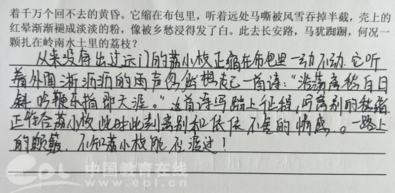 “云横秦岭家何在?雪拥蓝关马不前。”荔枝离枝,亦如游子远行。学生仿写古诗离别场景,将荔枝拟人化,赋予其思乡怀土之情。文学与情感在此交汇,历史的苍凉与个体的渺小跃然纸上。