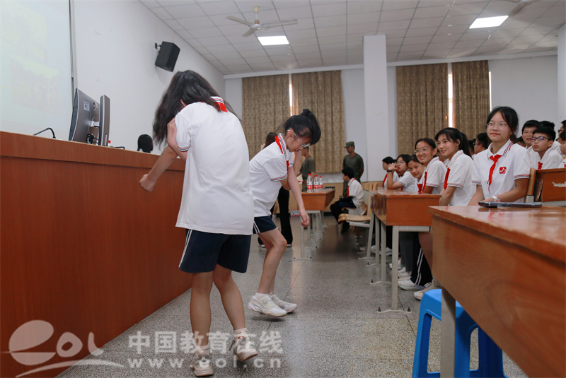 讲座中,六位同学上台体验飞行员抗眩晕训练:半弯腰、手放头部缓慢转圈。几圈后,有的同学便脚步不稳、表情吃力,体验到飞行员训练的艰辛。周大校借此阐述了飞行员日常训练的特殊意义,让同学们深刻认识到“国无防不立,民无防不安”的真正内涵。