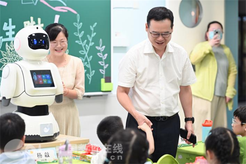 现场,智能机器人成为仪式亮点:它眨着LED眼,又念起文明礼仪儿歌。孩子们围成一圈,好奇地摸一摸、问一问,科技的魅力在此刻彰显。