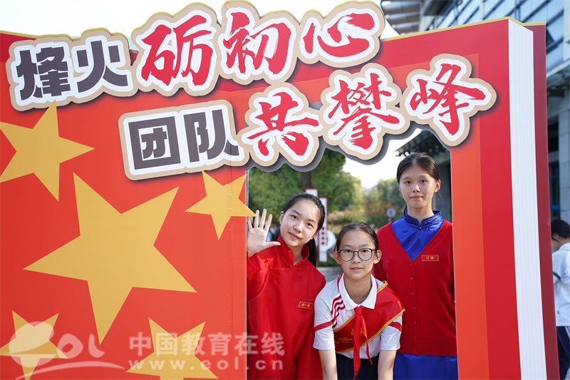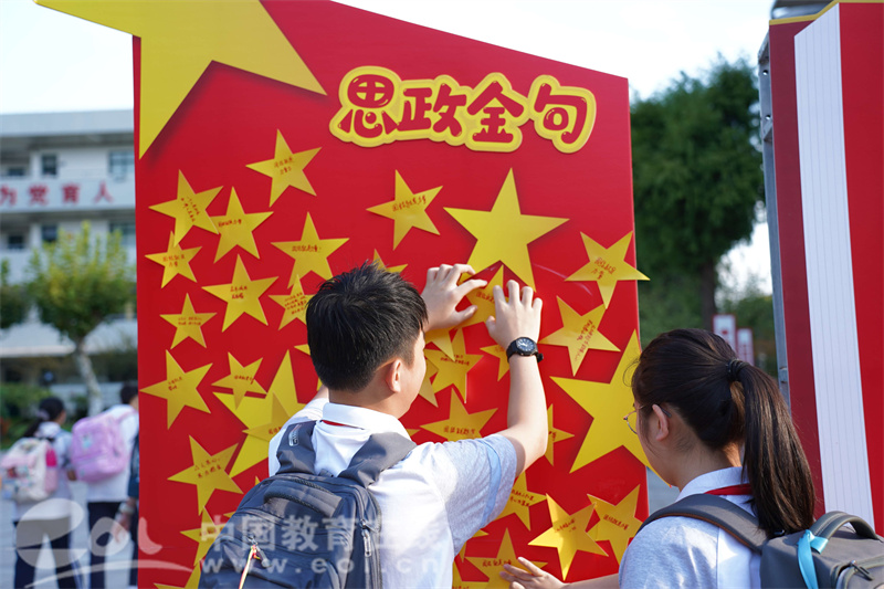 校门口,学子在“烽火砺初心,团队共攀峰”主题打卡墙前,写下对英雄的敬意和新学期的团队目标,在沉浸式体验中传递家国情怀的磅礴力量。
