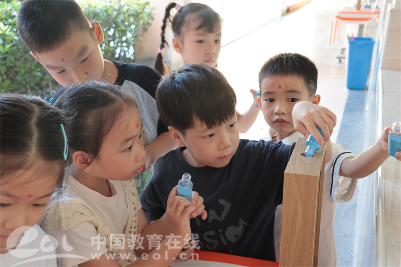 与以往不同,教室门口的流沙画,成了他们小学旅程的第一个“玩伴”。在每个一年级教室门口都设置了“流沙创作角”,桌上整齐摆放着透明画框与红、橙、黄、绿等十余种颜色的细沙。孩子们在老师的指导下有序参与:有的小心翼翼拿起装着蓝色细沙的小罐,慢慢倒入画框;有的和小伙伴分工合作,将粉色与黄色沙子分层铺洒;还有孩子尝试混合颜色,看着流沙交融出全新色块,眼睛里满是惊喜。随着画框被轻轻翻转,各色流沙缓缓流淌,化作“彩虹山”“彩色云朵”,孩子们的欢笑声在走廊里回荡。