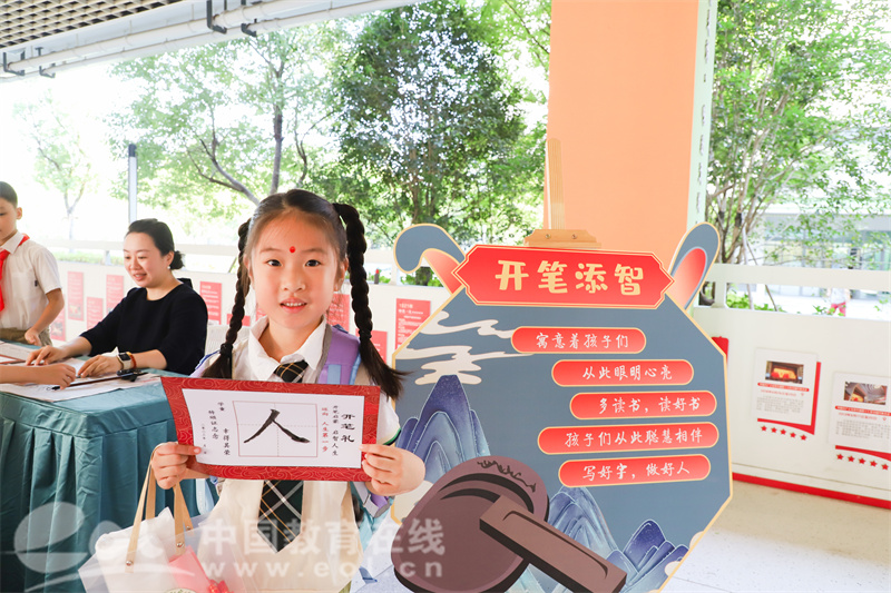 朱砂点智破蒙。老师手执朱笔,在学子额头轻点朱砂,开启智慧。“朱砂轻点,启智破蒙”,这一抹鲜红寄托着师长对孩子们最美好的祝愿,期盼他们眼明心亮,聪慧好学。开笔破蒙立人。在老师的指导下,孩子们认真执起毛笔,端身正意,一撇一捺地书写“人”字。开笔破蒙,书写人字,寓意从此眼明心亮,好读书、读好书,更要立身做人,成为正直之人。
