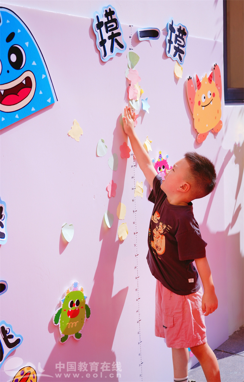 不远处的摸高挑战藏着关于“长大”的小秘密。孩子们仰着小脸,盯着摸高展板上清晰的刻度,深吸一口气后奋力踮起脚尖,把手中的彩色纸片稳稳贴在更高处时,总会忍不住欢呼:“我摸到140啦!我又长高了!”这个简单的摸高动作,让“成长”变得看得见、摸得着,那份“我又长大一点”的自豪感,在阳光下格外耀眼。