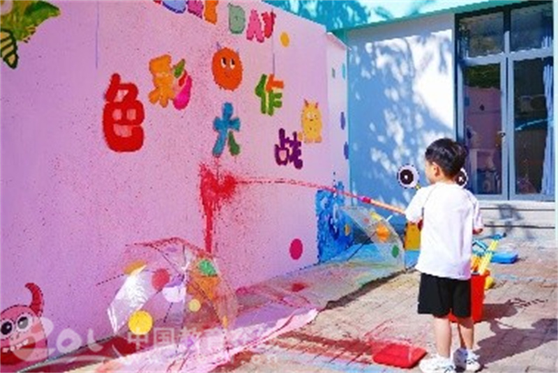 最热闹的当属 “水枪绘彩”环节。一把把水枪化身“成长魔法棒”,孩子们握着它,将红、黄、蓝、绿的颜料朝着白色长布喷洒而去:红色像流星划过,蓝色似涟漪扩散,黄色若光斑跳跃……他们用色彩实实在在地写下了成长的模样——从独自探索到并肩合作,从稚嫩尝试到自信创作,小小的身影里满是向上的力量。
