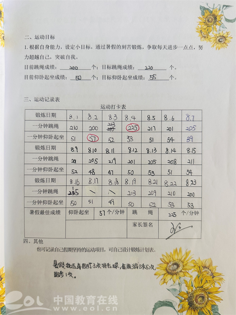家校协同促成长,为学生提供个性化锻炼指南,家长积极配合监督。通过暑期各年级体育实践作业,学生在假期中也坚持每日跳绳、仰卧起坐,记录运动点滴,运动记录表中写满了进步与坚持。据不完全统计,90%以上学生都能坚持锻炼并记录。在开学的双百赛事中,跳绳、仰卧起坐及体能成绩都有明显的提高与进步。