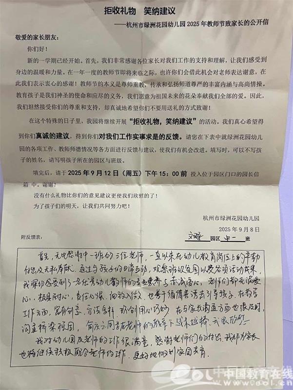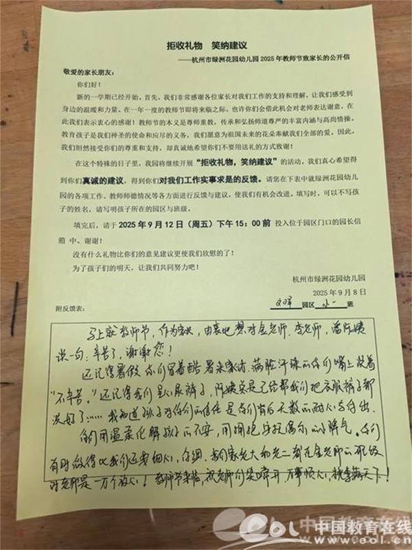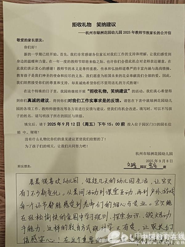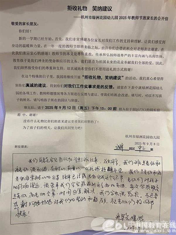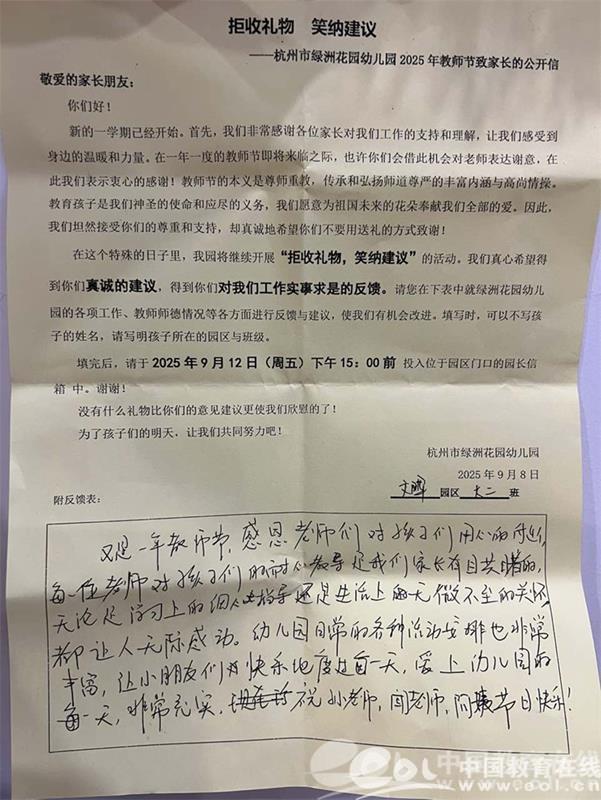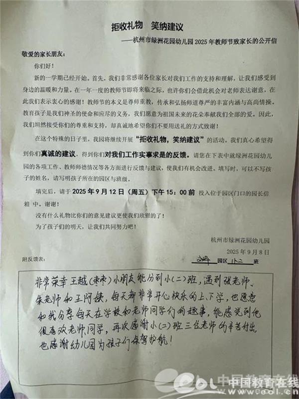 幼儿园在教师节前夕还开展了“拒收礼物 笑纳建议”活动,受到了家长们的热烈肯定,也收到了很多家长的祝福。