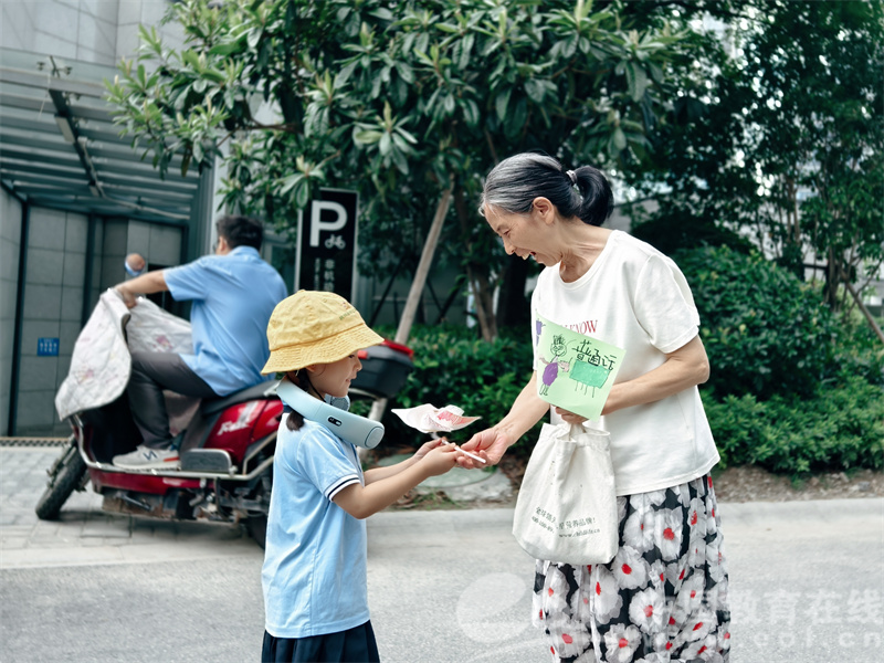 不仅如此,推普行动还走出了园区大门,走进了邻近的社区。活动前,孩子们精心制作“推普小礼包”:在书签上画文明用语场景,在折扇上写下“你好”“谢谢”,在风车上印上醒目的“请讲普通话”字样,每一件礼物都饱含心意。随后,“小小推普员”们列队走进社区,双手将礼物递到居民手中,用标准的普通话主动问候:“爷爷好,送您推普小礼品,我们一起说普通话!”“奶奶好,普通话让交流更方便哦!”居民们接过礼物,纷纷为孩子们的礼貌与热情点赞,有的还跟着孩子们一起念起了推普标语。这场温暖的社区互动,让推广普通话的种子播撒到了邻里之间。