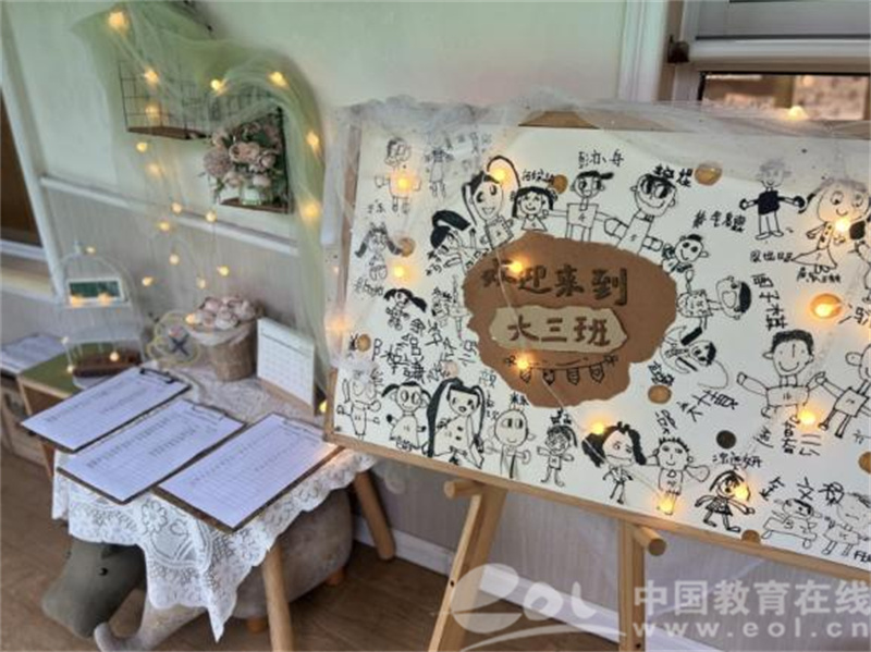 会场布置处处见巧思:手绘欢迎板印着全体幼儿姓名,星星灯串与成长身高尺烘托温馨氛围,孩子们的自画像、笑脸标记的水瓶错落摆放,以幼儿视角传递“以幼为本”的教育理念,让家长直观感受园方诚意。
